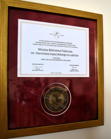 Miejska Biblioteka Publiczna im. Hieronima Łopacińskiego w Lublinie została wyróżniona medalem pamiątkowym „550-lecia Województwa Lubelskiego”. Wręczenie odznaczeń miało miejsce podczas spotkania w siedzibie Wojewódzkiej Biblioteki Publicznej w Lublinie. Z rąk Marszałka Województwa Lubelskiego Jarosława Stawiarskiego oraz Wicemarszałka Województwa Lubelskiego Zbigniewa Wojciechowskiego medal odebrał Dyrektor MBP Lublin Piotr Tokarczuk.