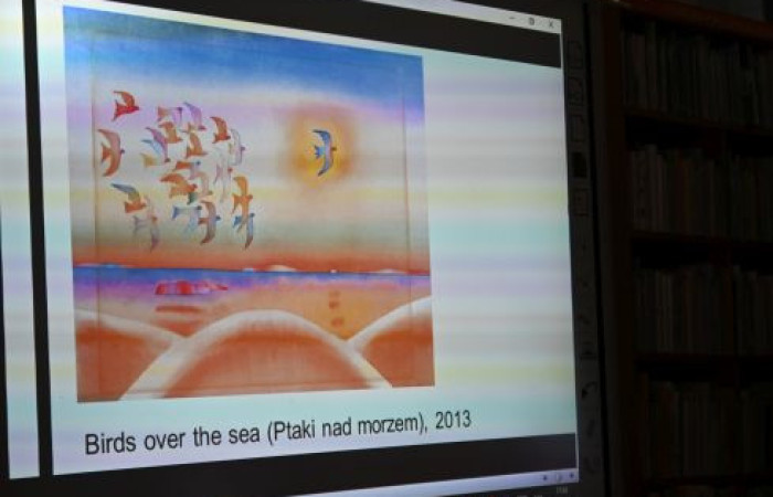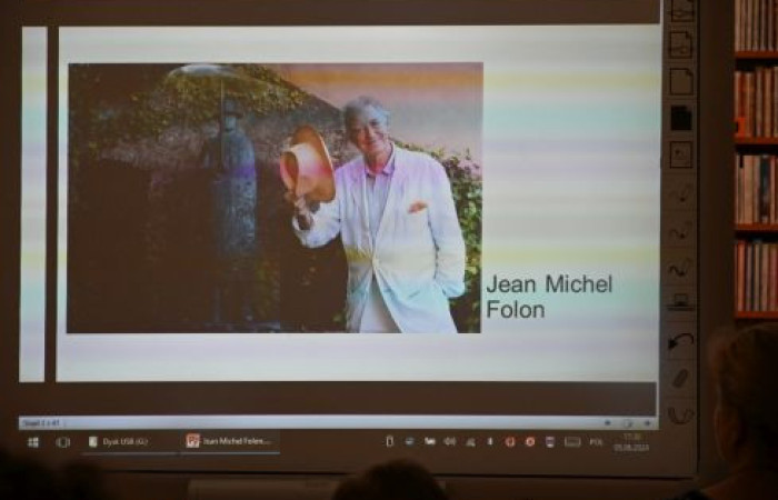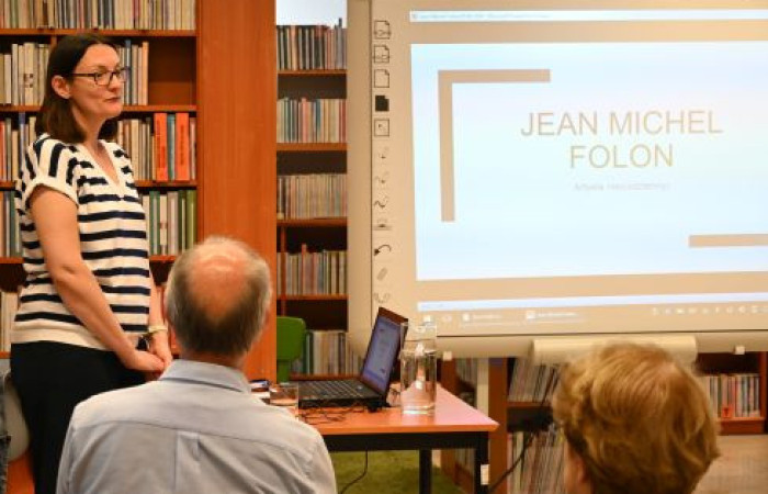 Nasza gościni przybliżyła zebranym słuchaczom sylwetkę, biografię i twórczość Jeana Michela Folona, urodzonego w 1934 roku artysty belgijskiego, wizjonera codzienności. Po studiach architektonicznych Folon rozpoczął edukację na wydziale wzornictwa przemysłowego – to wtedy oddał się pracom malarskim. Wyemigrował do Francji i próbował publikować swoje rysunki – szkice ilustrujące aktualności – w prasie, jednak jego prace zyskały popularność i uznanie dopiero w Stanach Zjednoczonych. Bardzo duże zainteresowanie jego szkicami wykazały tak cenione czasopisma, jak New Yorker, The New York Times czy Esquire. W latach 60. zapoznał się z Saulem Steinbergiem, ilustratorem i karykaturzystą: artyści zaprzyjaźnili się, współpracowali ze sobą i mieli wzajemny wpływ na swoją twórczość. Od lat 60. prace Folona były coraz częściej wystawiane w galeriach – w 2005 roku we Florencji odbyła się jego największa i jedna z ostatnich wystaw, część prac została przekazana miastu. Od roku 1965 Folon zaczął interesować się kolorem, a w latach 70. artysta, wcześniej skoncentrowany na rysunkach tuszem, zaczął malować akwarele. Na jego obrazach bardzo często przewijają się motywy podróży, statków, motywy zwierzęce i figury ludzkie. Bardzo istotne w twórczości Folona jest podejście do kontrastu miasta/natury. Twórca ilustrował codzienność człowieka w mieście, przedstawiał jednostkę w tłumie, jej anonimowość i brak indywidualności jednocześnie. Przedstawiał tym samym oderwanie człowieka od jego naturalnego środowiska i „wchłonięcie” przez miasto. Folon był przy tym czynnym aktywistą na rzecz ochrony środowiska – współpracował między innymi z Greenpeace. Znajomość z Jacquesem Marquetem zapoczątkowała w twórczości Folona okres sitodruku – były to dzieła mniej oszczędne w środkach niż akwarele, jednocześnie o bardzo intensywnym wyrazie. Pod koniec 1989 roku Folon zaczął tworzyć rzeźby – zazwyczaj postaci ludzkich – które były umiejscawiane w przestrzeniach miejskich (między innymi w Brukseli). Folon lubił podejmować dialog z widzem, przywiązywał jako plakacista dużą wagę do spojrzenia. Jako wybitny twórca plakatów cechował się zdolnością szybkiej komunikacji z widzem. Folon zmarł w 2005 roku w wieku 71 lat. W 90. urodziny Folona odbył się konkurs o tematyce „między marzeniem a rzeczywistością”, na który napłynęło aż 400 prac nawiązujących do twórczości artysty.