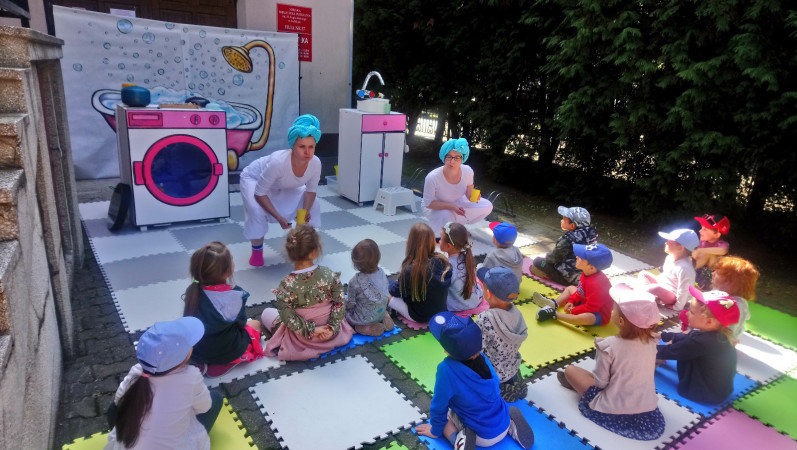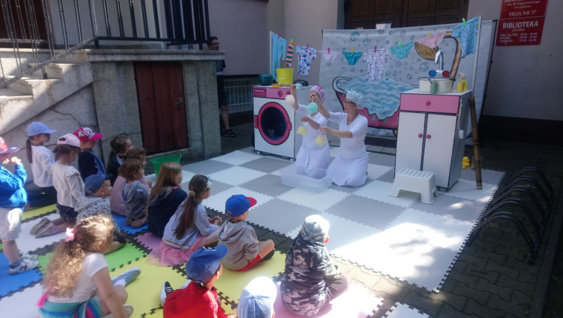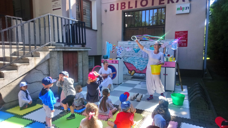 Czy kąpiel, mycie zębów, robienie i wieszanie prania można zamienić w zabawę? Dzięki naszym dzisiejszym gościom mieliśmy okazję przekonać się, że jest to możliwe. Panie Natalia Sacharczuk i Katarzyna Staniewska zaprezentowały naszym najmłodszym czytelnikom, spektakl pt. „Łazienkowe fiku-miku”. Założeniem przedstawienia było nie tylko dobra zabawa, ale przede wszystkim stymulacja wzroku, słuchu, poczucia rytmu i dotyku, a także rozwijanie dziecięcej kreatywności i wyobraźni.