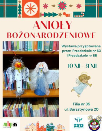 Filia nr 35 zaprasza na bardzo świąteczną wystawę "Anioły Bożonarodzeniowe". Anielskie prace wykonały dzieci z Przedszkoli nr 63 i 88 wraz z rodzicami i wychowawczyniami. Zapraszamy serdecznie!