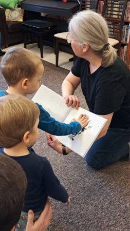 Bibliotekarka czyta dzieciom książkę, pokazując ilustrację z lokomotywą