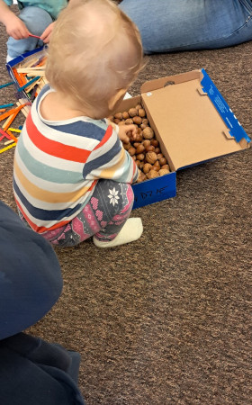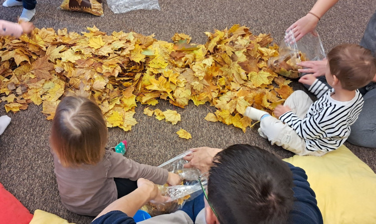 Na dywanie rozsypane jesienne liście, dzieci zbierają do woreczka