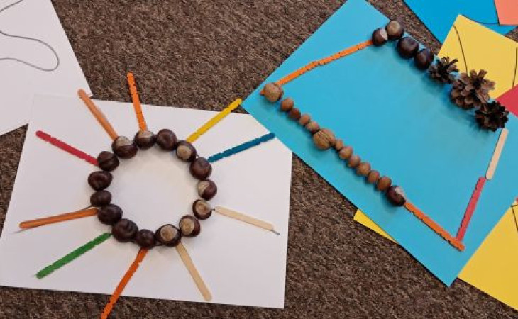 Na kartce naklejone kasztany i kolorowe paski papieru