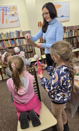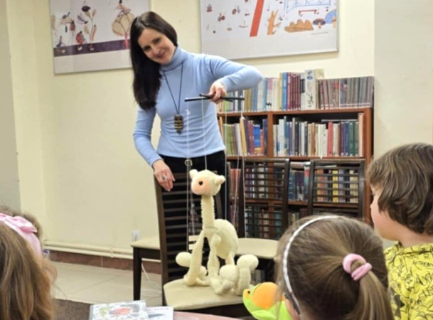 Bibliotekarka demonstruje dzieciom marionetkę