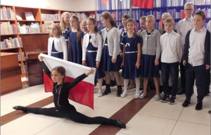 Dziewczyna z flagą Polski w wykonaniu artystyczej akrobacji w tle grupa dzieci