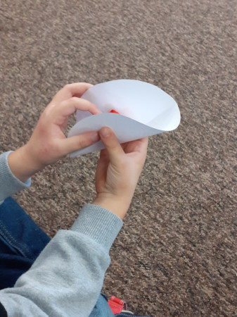 Ręce dziecka pokazują jak się lepi papierowe pierożki