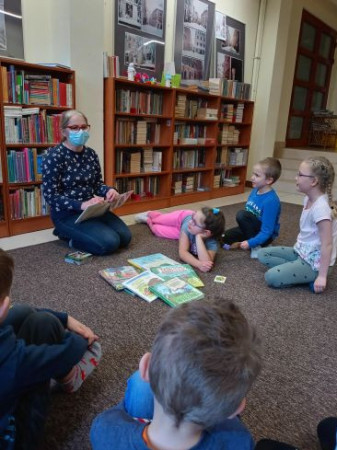 Bibliotekarka z dziećmi siedzi na dywanie i rozmawiają o książkach