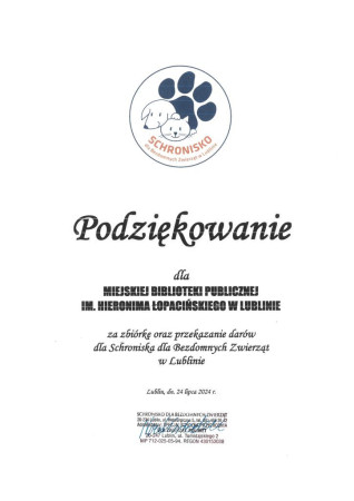 Miejska Biblioteka Publiczna w Lublinie zakończyła zbiórkę darów na rzecz Schroniska dla Bezdomnych Zwierząt w Lublinie. Akcja rozpoczęła się 1 lipca - w dniu, w którym obchodzimy w Polsce Dzień Psa - a jej ostatni dzień przypadł na 22 lipca. Zbieraliśmy karmę suchą i mokrą dla psów i kotów (w tym także specjalistyczną, dla zwierząt z problemami zdrowotnymi), zabawki, smaczki, smycze i obroże oraz mleko dla szczeniąt.