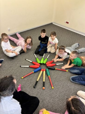 W poniedziałek dzieci stawiały pierwsze kroki w żonglerce. Poznały rekwizyty żonglerskie, chusty oraz maczugi i nauczyły się jak z nich korzystać. W środę uczestnicy trenowali nowe umiejętności wykorzystując do tego: piłki, obręcze i talerze. Natomiast w piątek było dużo ruchu i zabawy. Dzieci utrwaliły zdobyte umiejętności żonglerskie i podzieliły się z kolegami pomysłami na własne sztuczki z wykorzystaniem dostępnych rekwizytów. Dziękujemy wszystkim uczestnikom za zaangażowanie.