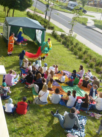 Do Filii nr 36 zawitał Teatr w ogrodzie ze spektaklem „Nowe szaty króla” według Hansa Christiana Andersena. Tereny zielone pod biblioteką zapełniły się widzami, którzy aktywnie uczestniczyli w przedstawieniu.