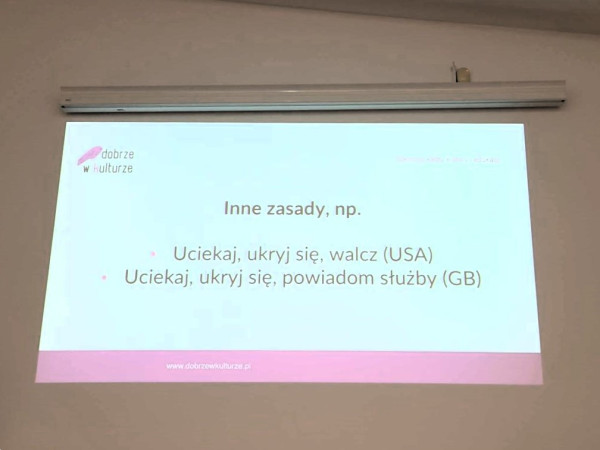 Akty agresji i przemocy coraz częściej dotykają instytucji publicznych, ich pracowników i interesantów. Podczas szkolenia uczestnicy zapoznali się z zasadą „4U – uważaj, uciekaj, ukryj się, udaremnij atak” podkreślającą rolę prewencji w zapobieganiu zdarzeniom o charakterze terrorystycznym. Ponadto, dowiedzieli się jak reagować na wkroczenie na teren placówki uzbrojonej i niebezpiecznej osoby, jak rozpoznać podejrzaną przesyłkę i co robić w przypadku jej otrzymania. Przećwiczyli przyjmowanie informacji o podłożeniu ładunku wybuchowego oraz dowiedzieli się jak udzielać pierwszej pomocy w sytuacji zagrożenia.