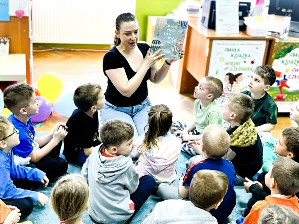 Bibliotekarka pokazuje dzieciom książkę zatytułowaną: "Świat chce, byś był sobą"