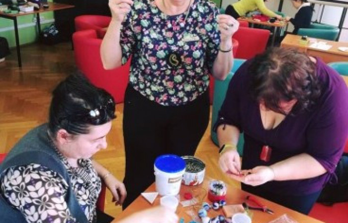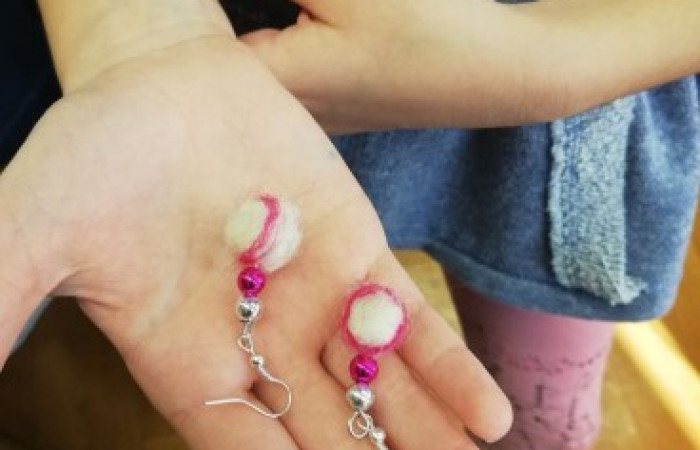 Panie z wielkim zaangażowaniem uczyły się nowej techniki, ale czasem igła płatała figle i zamiast wbić się w wełnę, wbijała się w palec! Jak widać po zdjęciach, nie zniechęciło to jednak naszych Uczestniczek i stworzyły one wiele prac, które będą pięknie zdobić ich dekolty oraz uszy. Dziękujemy za przybycie!