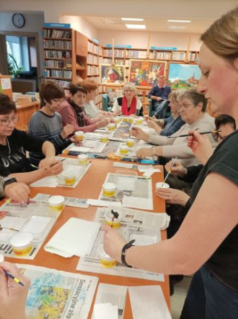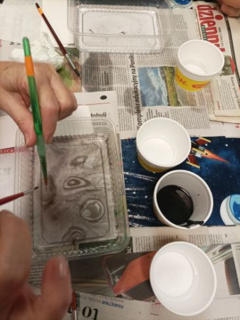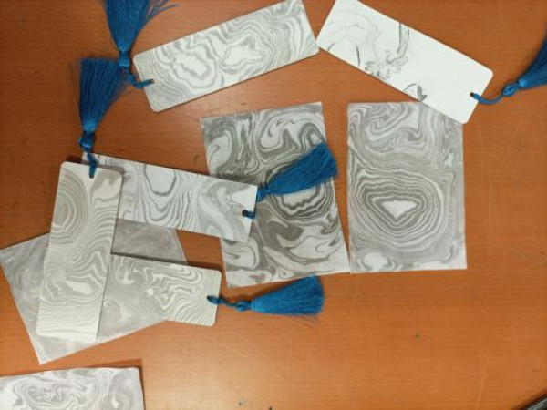 Suminagashi - starożytna japońska technika artystyczna, oznaczająca "pływający tusz", polegająca na tworzeniu wirujących wzorów na powierzchni wody, które następnie przenosi się na papier. To daje unikalne, marmurkowe efekty. Ta relaksująca forma sztuki pozwala na tworzenie wyjątkowych kompozycji. Japońską metodę dekorowania wykorzystała Joanna Demska do tworzenia zakładek do książek. W warsztatach wzięli udział seniorzy z Klubu Seniora „Głusk”.