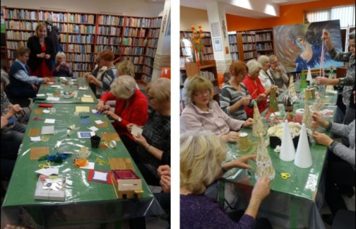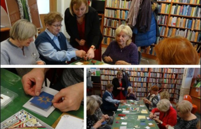 Z okazji zbliżających się Świąt Bożego Narodzenia Filia nr 34 tradycyjnie przygotowała warsztat plastyczny dla seniorów. Tym razem mieliśmy przyjemność gościć Panią Olgę Wójtowicz, bibliotekarkę z Filii nr 18, która wprowadziła seniorki w tajniki haftu strukturalnego. Pani Olga pokazała uczestniczkom warsztatu własnoręcznie ozdobione haftem kartki świąteczne i krok po kroku przeprowadziła seniorki przez proces twórczy haftu strukturalnego.