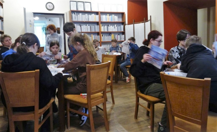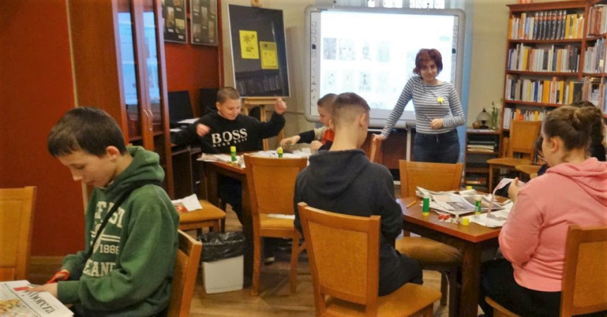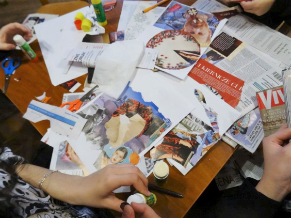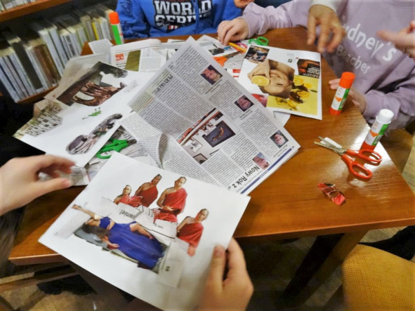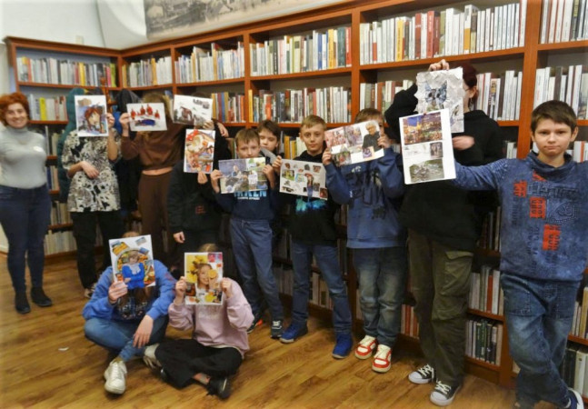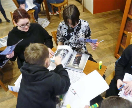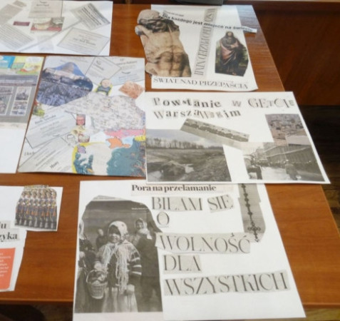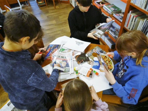 Z okazji 80. rocznicy powstania w Getcie Warszawskim w Filii nr 21 przygotowano także warsztaty plastyczne, by upamiętnić pierwsze powstanie miejskie w okupowanej Europie, które stanowiło największy zryw ludności żydowskiej w czasie II wojny światowej. Wyrażeniem emocji związanych z poczuciem zagrożenia wobec takich sytuacji były kolaże wykonywane przez uczniów klasy V ze Szkoły Podstawowej nr 24. Gościłyśmy także młodzież z klasy VII, która w szczególnie dojrzały sposób podeszła do tematu i zaprezentowała bardzo refleksyjne prace plastyczne.