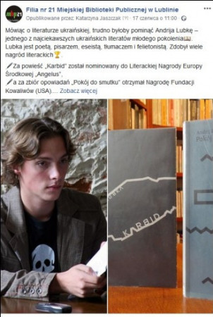 Tydzień 15-19 czerwca poświęcony był w Filii nr 21 współczesnej literaturze naszych sąsiadów, ponieważ wydaje się, że wciąż niewiele o niej wiemy. Zaprezentowałyśmy sylwetki czołowych, nagradzanych pisarzy ukraińskich i białoruskich. Byli to Andrej Adamowicz, Julia Cimafiejewa, Alhierd Bacharewicz, Andrij Lubka, Natalka Śniadanko, Kateryna Babkina oraz Andrij Bondar. Książki tych autorów, wydane przez Warsztaty Kultury, dostępne są w ofercie naszej filii.