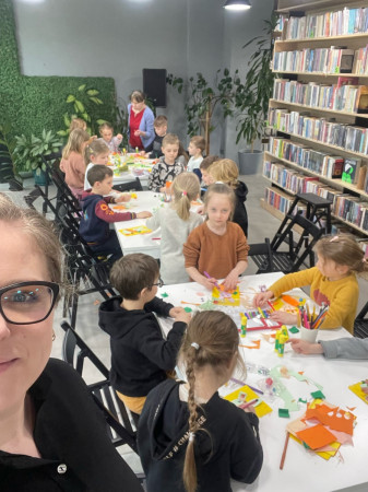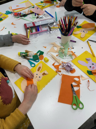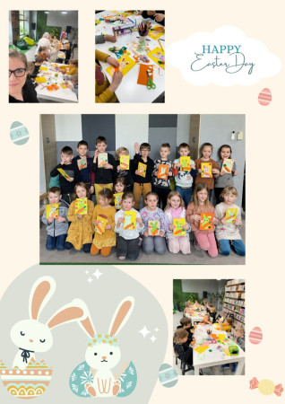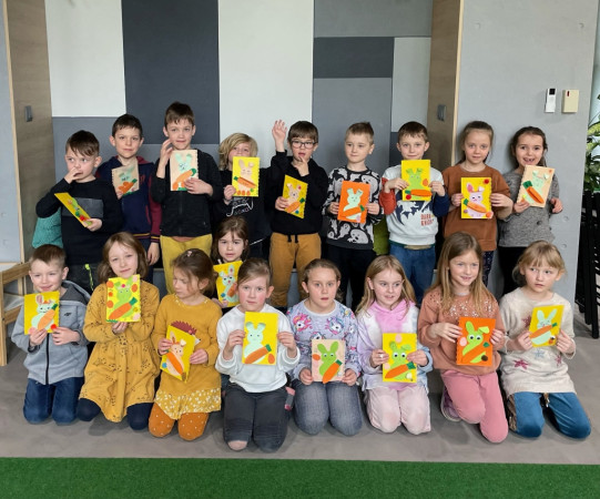 1. 27.03.2023r. na zajęcia do Bioteki przybyły dzieci z Przedszkola nr 19, podczas których dzieci wykonywały kartki świąteczne 3D z zającem trzymającym w łapkach marchewkę skrywającą wewnątrz życzenia wielkanocne.