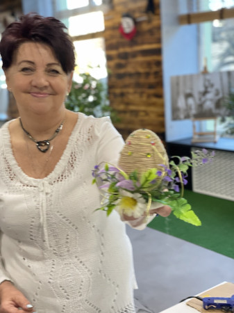 Uczestniczka warsztatów prezentuje stroik w formie jajka ozdobiony kwiatami