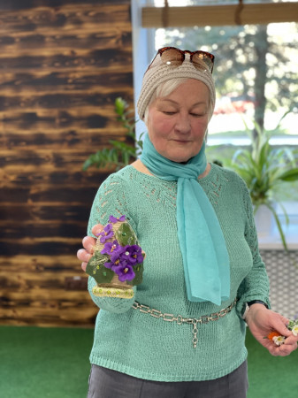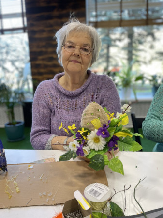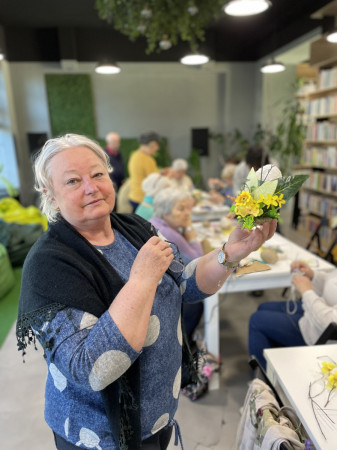 Uczestniczka warsztatów z ukwieconym stroikiem w kształcie jajka