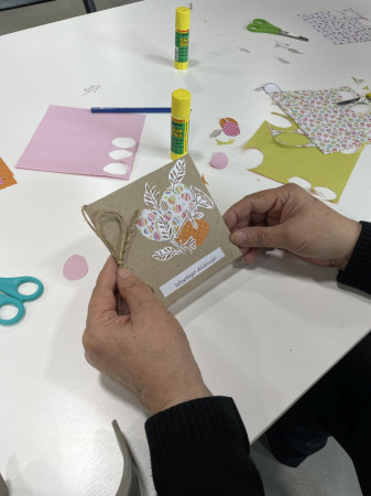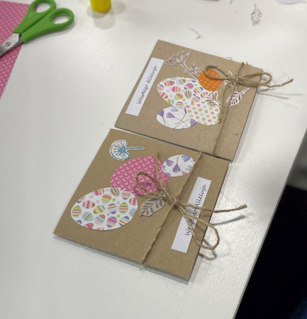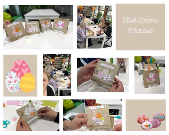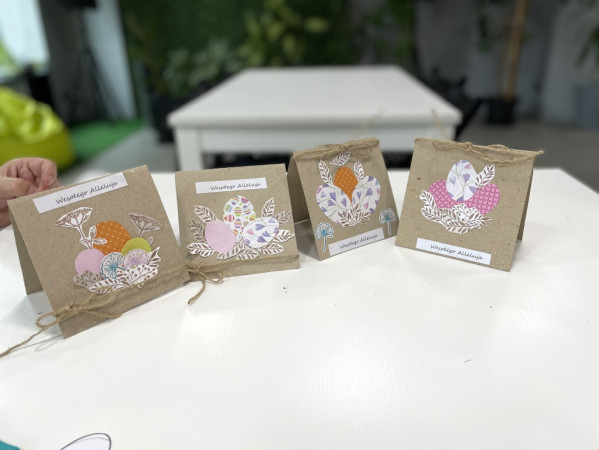 3. 30.03.2023r. Panie z Klubu Seniora Wieniawa wykonywały kartki wielkanocne. Wykorzystywane zostały bazy eco do stworzenia minimalistycznych kartek utrzymanych w duchu „mniej znaczy więcej”.