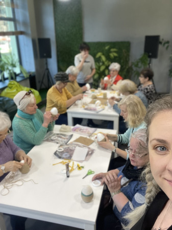 Na zdjęciu fragment twarzy robiącej selfie, w tle seniorki robiące wielkanocne stroiki