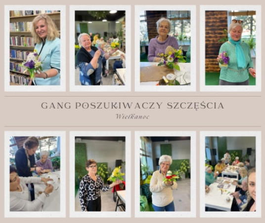 Kolaż ze zdjęć z warsztatów z seniorami, pośrodku napis: "Gang poszukiwaczy szczęścia - wielkanoc"