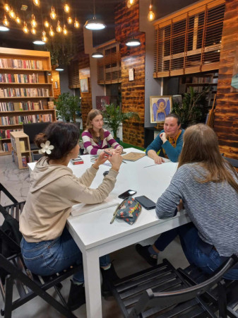 Młode kobiety siedzą przy stole nad arkuszami papieru i rozmawiają