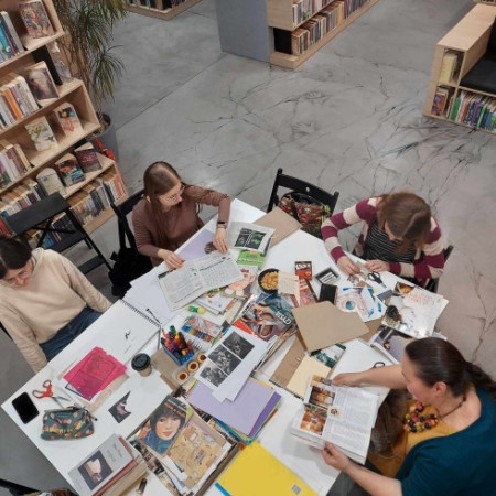 Widok z góry na stół pełen książek i wycinków, nad którymi pochylają się młode kobiety