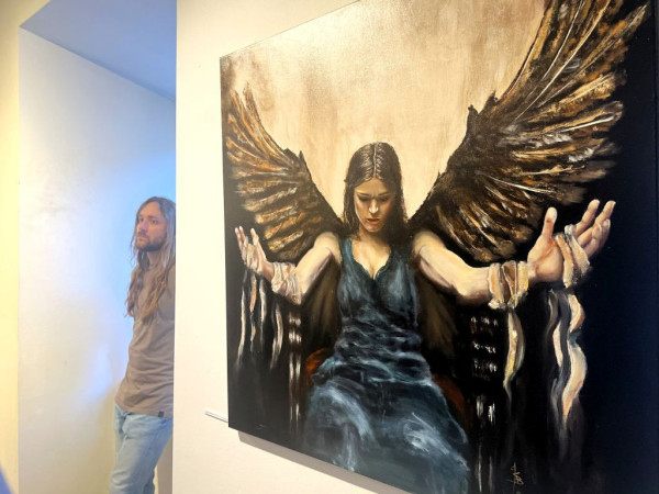Obraz przedstawiający kobietę z ciemnymi skrzydłami, obok obrazu stoi mężczyzna