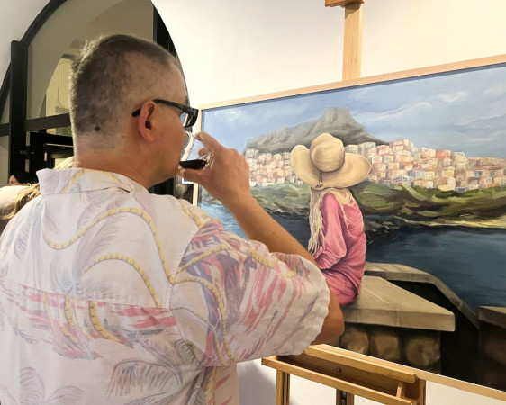 Pijący wino mężczyzna przygląda się jednemu z obrazów prezentowanych na wystawie