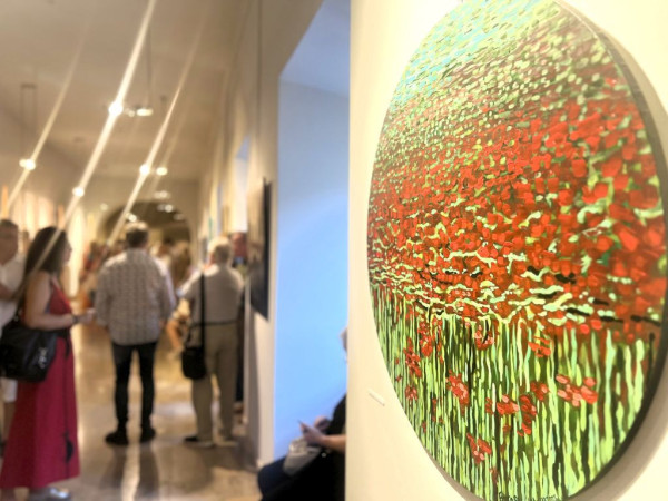 Okrągły obraz na pierwszym planie, w tle wernisażowi goście