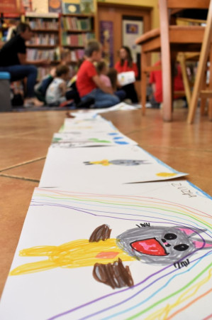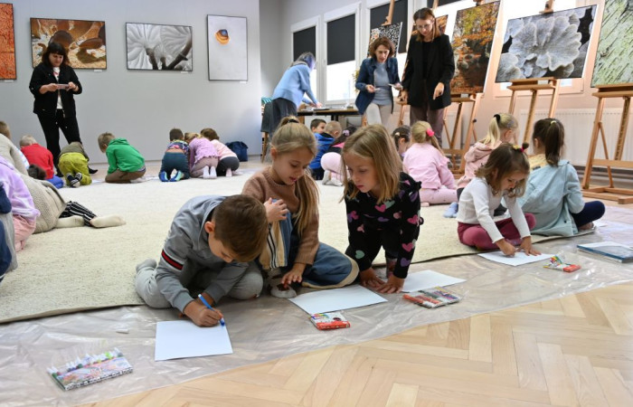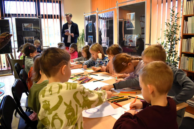 Dzieci przy stole malują obrazki - w tle galeria biblioteczna