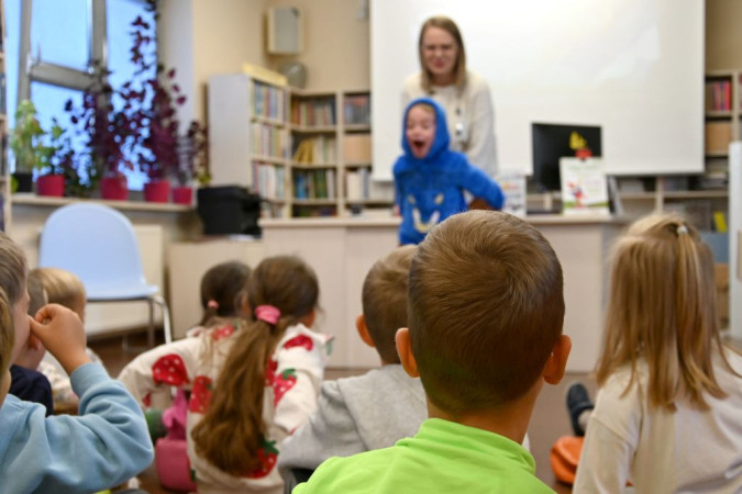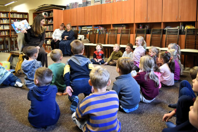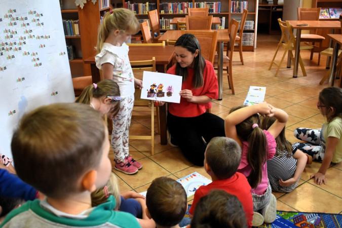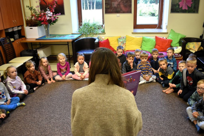 Barbara Supeł czyta dzieciom książkę i prezentuje ilustracje