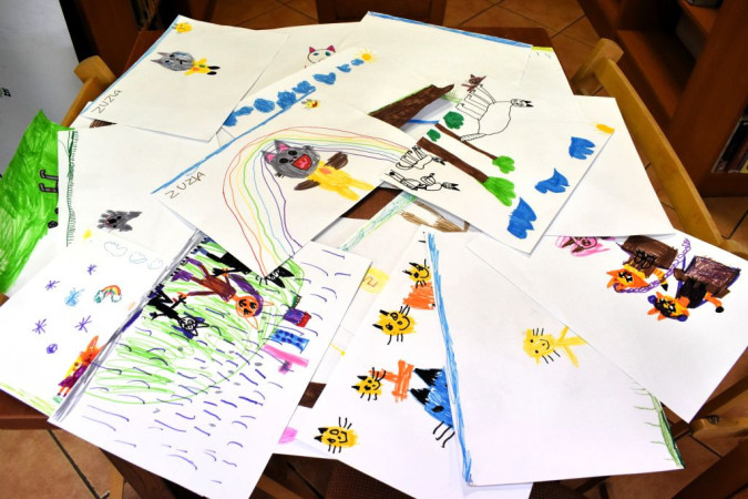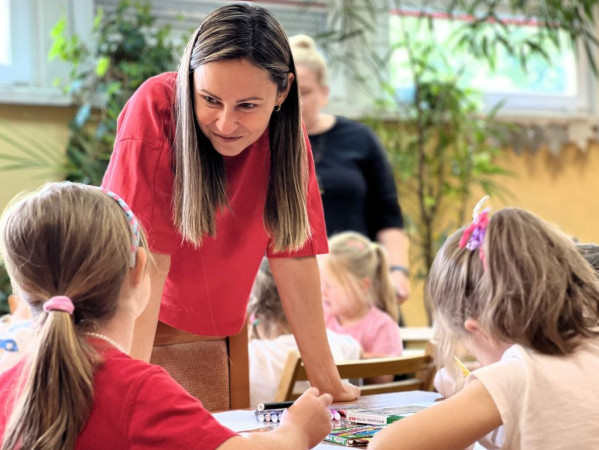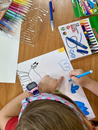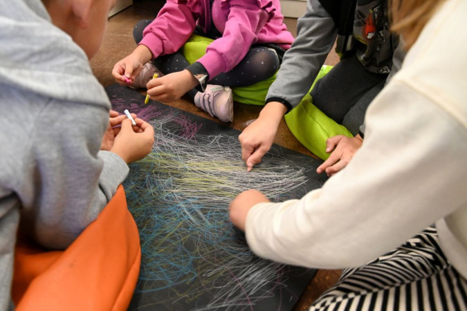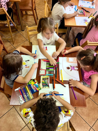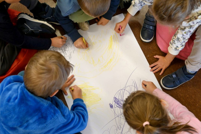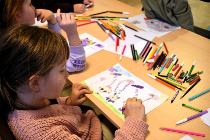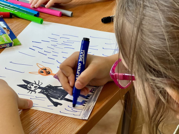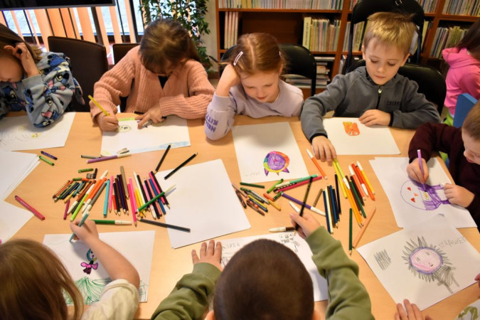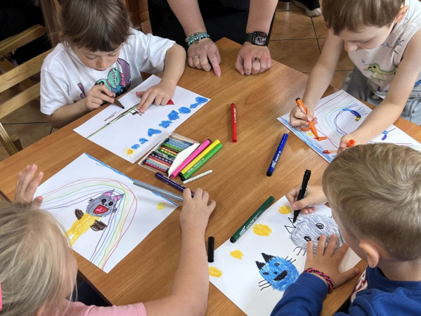 Przy stole siedzą dzieci pochylone nad kartką, przed nimi kartki i kolorowe flamastry