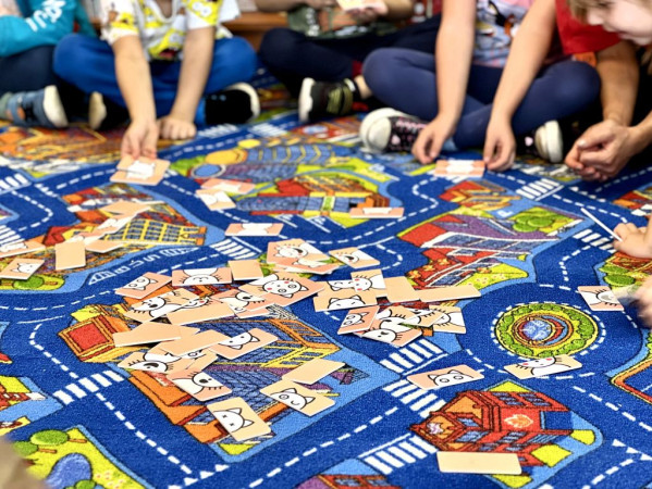 Widok z góry na siedzące na podłodze dzieci - przed nimi ułożone układanki