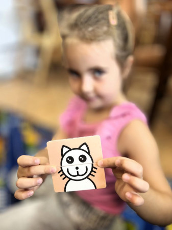 Dziewczynka trzyma złożoną układankę przedstawiającą uśmiechniętego kota