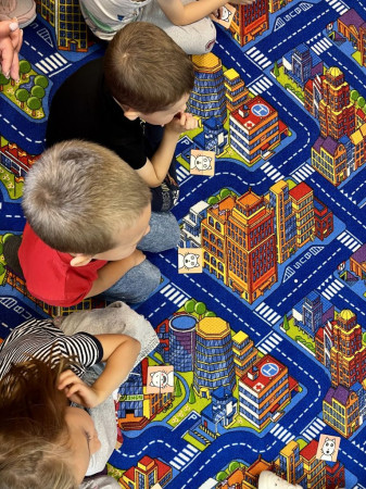 Autorka rzuca dużą materiałową kostką, dzieci śledzą ruch