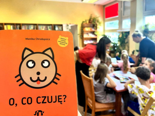 Na pierwszym planie okładka książeczki "O, co czuję?" z kotem na okładce, w tle dzieci malujące obrazki