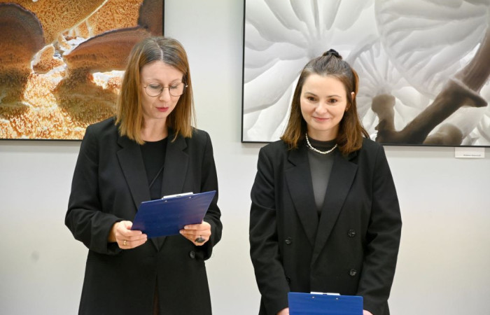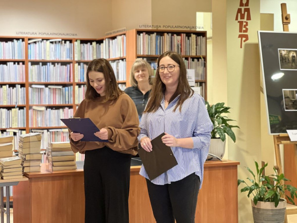 Katarzyna Poleszak i Marzena Borkowska zapowiadają warsztaty i przedstawiają gościa, za nimi kierowniczka Filii nr 31