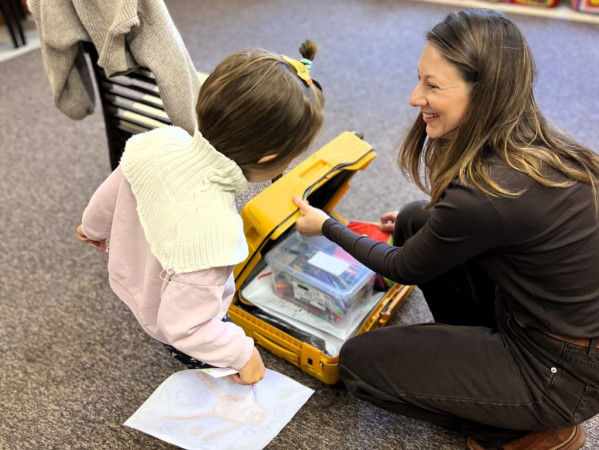 Dziewczynka pokazuje pracę plastyczną prowadzącemu zajęcia