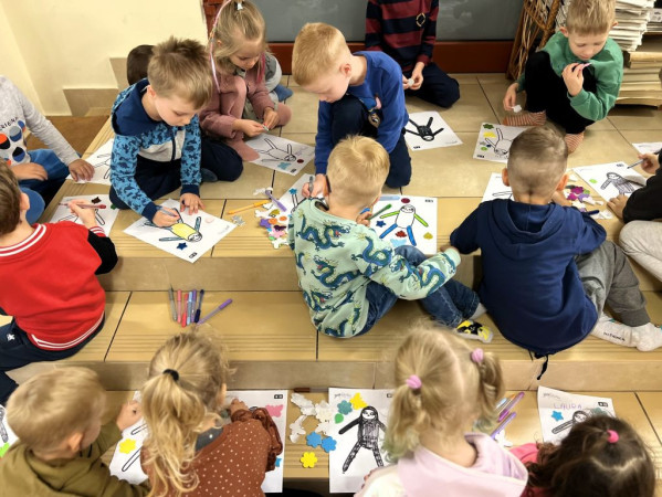 Dzieci siedzą na podłodze i tworzą prace plastyczne z leniwcem