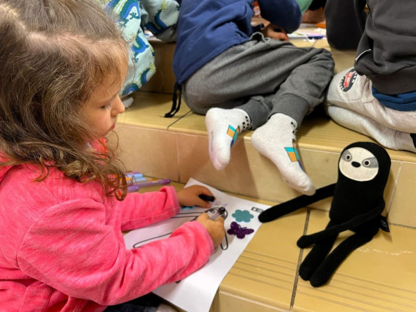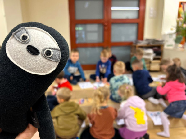Na pierwszym planie maskotka leniwca, w tle dzieci kolorujące obrazki