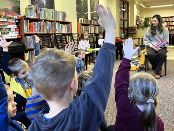 Dzieci zgłaszają się do odpowiedzi podczas rozmowy z autorką