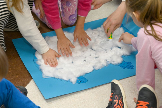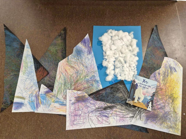 Nie zabrakło też sztuki i muzyki. W grupach dzieci malowały swoje wyobrażenia muzyki na kartonach, a następnie poruszały się w rytmie różnych utworów. Prowadząca wykorzystała te prace, by wyciąć góry i wspólnie z dziećmi stworzyć dużą ilustrację przedstawiającą Yetiego w górach, inspirowaną kartą tytułową książki.
