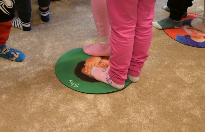 Dzieci stoją w kole , na dywanie rozłożone plansze z twarzami dzieci i ich emocjami