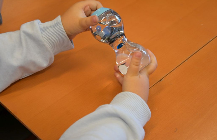 Widok na kolorową wykładzinę, w kadrze: dziecięca stopa i dłonie układające mini puzzle