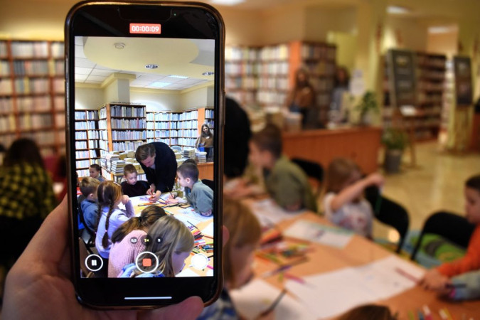Na pierwszym planie wyświetlacz w telefonie, a na nim Monika Chrabąszcz. W tle - dzieci podczas warsztatów