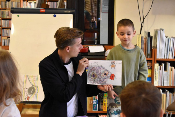 Artur Gębka pokazuje dzieciom jedną z ilustracji swojej książki, podczas gdy one tworzą swoje prace