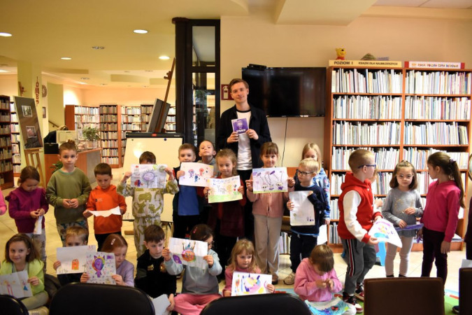 Wspólne zdjęcie prowadzącego i dzieci pozujących ze swoimi rysunkami
